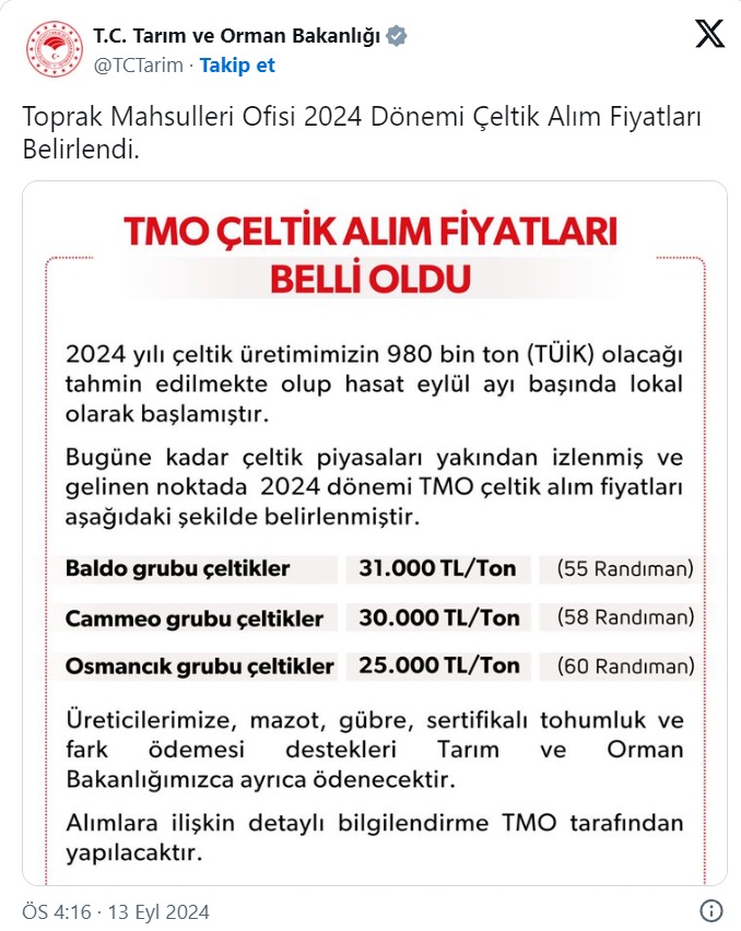 TMO 2024 dönemi çeltik alım fiyatlarını duyurdu. Ayrıca kurum, 2024 dönemi çeltik hasadına eylül ayı itibarıyla başlandığını ve üretimin 980 bin ton olacağını öngördüklerini de bildirdi.