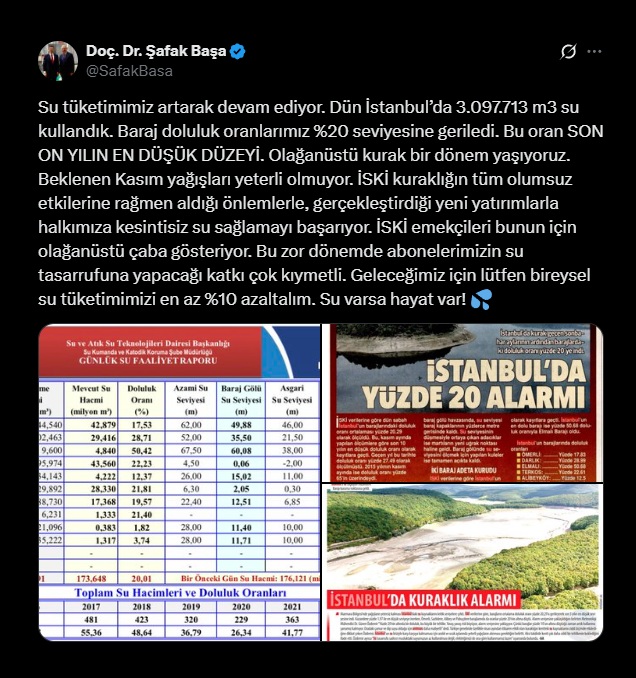 İSKİ Genel Müdürü Şafak Başa, sosyal medya hesabından İstanbul’daki su tüketimi ve baraj doluluk oranları hakkında uyarıda bulundu. Başa, kentte baraj doluluk oranlarının yüzde 20 seviyesine gerileyerek son on yılın en düşük düzeyine indiğini, Kasım yağışlarının yeterli olmadığını belirtti.