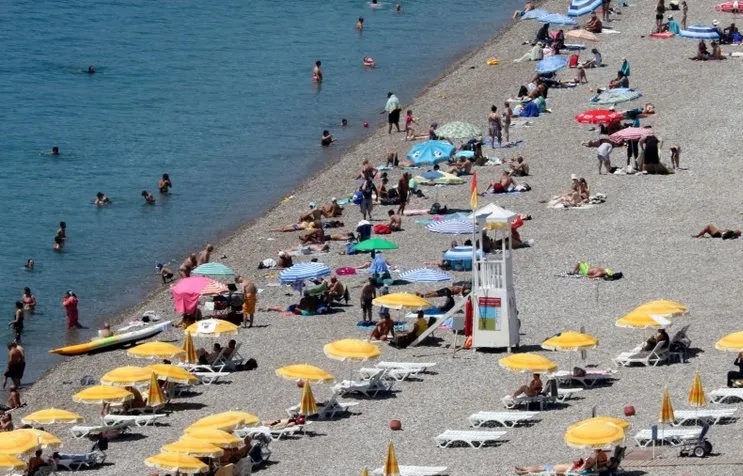 Antalya'da sıcaktan bunalan yerli ve yabancı turistler, dünyaca ünlü Konyaaltı Sahili'ne akın etti. Kent merkezinde